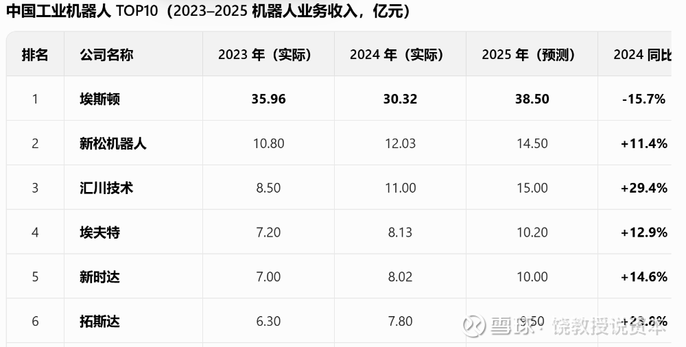 我让豆包给我列了下工业机器人排名,前六如上,其中汇川技术很赚钱,但有点不一样,所以我把它放在下一篇来讲,剩下5家加一家华中数控,2024年业绩如下:
