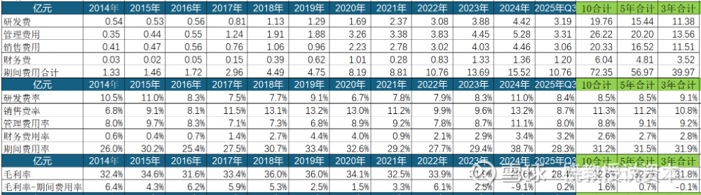 (1-毛利率)=营业成本/营业收入,前面我们已经看过毛利率。这里我们看下期间费用,期间费用就是与营业收入变化无关仅仅与期间相关的费用开始,管理费用、研发费用、销售费用,这三项与经营直接相关,财务费用与借款负债资金运用相关。毛利率销售费用率前面看过,这里只看合计的期间费用数据。埃斯顿是TOB公司,只需要看销售费用,如果TOC公司还要看毛销差。
