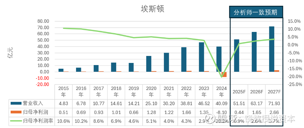 埃斯顿营业收入规模不小,利润很低,2023年归母净利润率只有2.9%,2027年分析师一致预期,归母净利润率也只有3.7%。