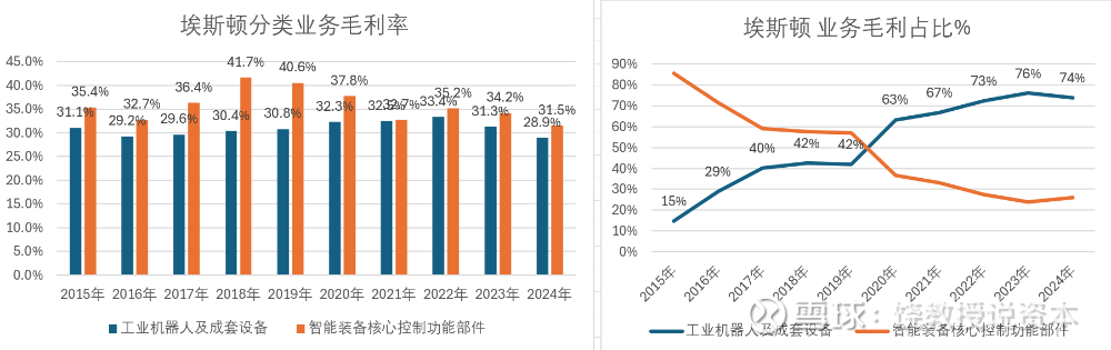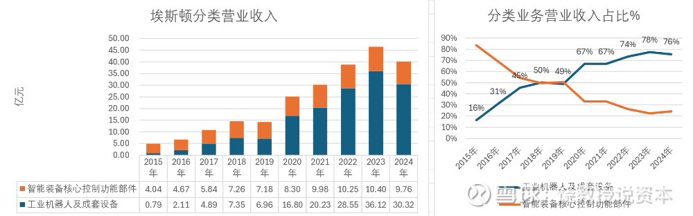 埃斯顿机器人核心部件起家,向下延伸到机器人本体和成套设备。2024年机器人和成套设备营业收入30.32亿,占比76%。