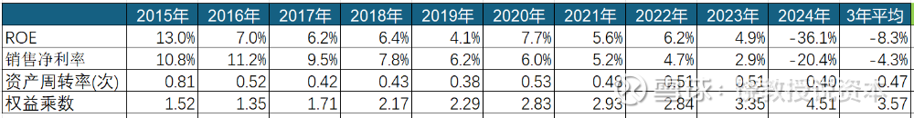 企业不赚钱,ROE自然不好,最好的年份就是刚上市规模小的2015年,13%,也就一般,之后从来没上过10%,2023年只有4.9%。从杜邦三兄弟看,产品不赚钱,资产周转慢,杠杆加的很高,全是不好的信号。