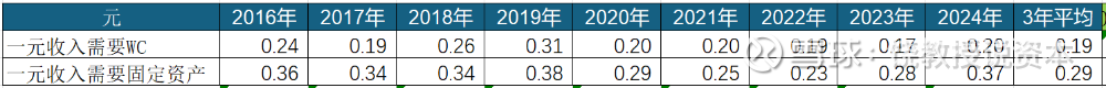 埃斯顿一元收入需要WC,2022-2024年3年平均0.19,中等水平,需要垫钱做生意,但是垫的也不多。