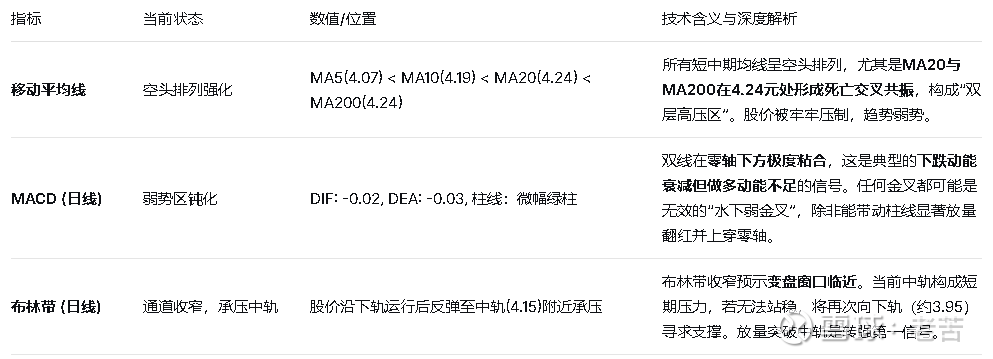 对于趋势交易者(右侧): 坚决规避。在所有趋势指标转为多头排列之前,不存在系统性机会。值得关注的右侧信号包括:连续放量站稳4.30元、MACD零轴上金叉、股东户数显著下降。