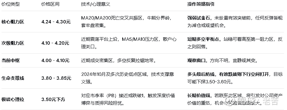 对于价值挖掘者(左侧): 当前并非理想入场时点。财务底(连续季度扣非盈利)和技术底(均线系统走平拐头)均未明确。若极度看好其资产价值与转型决心,可设定极端情景下的观察区间(如3.50-3.80元),并严格控制仓位,作为长期布局的“种子头寸”。