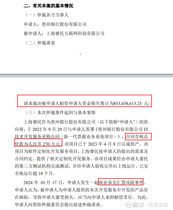 2025年1月20日,贵州银行(6199.HK)以“系统缺陷导致商业承兑汇票风险事件”为由,将高伟达(300465.SZ)旗下子公司上海睿民互联网科技有限公司(下称“上海睿民”)告上仲裁庭,索赔金额高达5365.86万元。