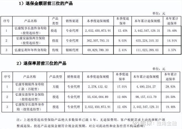 根据弘康人寿2025年2季度偿付能力报告,上半年弘康悦享长盈终身寿险(投资连结型)累计退保34.43亿元,退保金额最高;弘康零极限终身寿险C款(万能型)累计退保率28.92%,退保率最高。