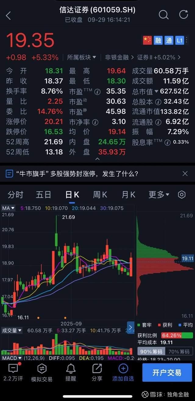 二是信达证券于2023年2月1日成功在上交所主板挂牌上市,跻身上市券商之列。该股发行价8.25元/股,上市首日开盘价13.07元。截至2025年9月29日,该股收报19.35元/股,较上市当日上涨48%,最新市值627.52亿元。
