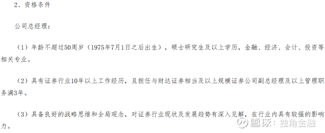 对总经理人选的要求是,不超过50周岁,研究生及以上学历,具有证券行业10年以上工作经历,且担任与财达证券相当及以上规模证券公司副总经理及以上管理职务满3年。
