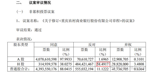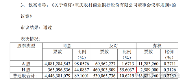 2025年12月10日,在重庆农商行2025年第一次临时股东大会上,对《关于修订〈重庆农村商业银行股份有限公司章程〉的议案》(下称:《公司章程》)和《关于修订<重庆农村商业银行股份有限公司董事会议事规则>》(下称:《董事会议事规则》)的两项议案,分别遭到58.49%、55.6%的参会H股股东反对。