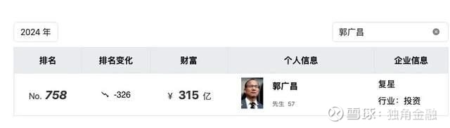 2024年胡润全球富豪榜,勾勒出“复星系”实控人郭广昌的财富变迁,其个人财富值定格在315亿,对比2020年640亿的身家已缩水过半。这位曾经叱咤上海滩的前首富,近年来正以密集出售资产的方式,为复复系“回血”。