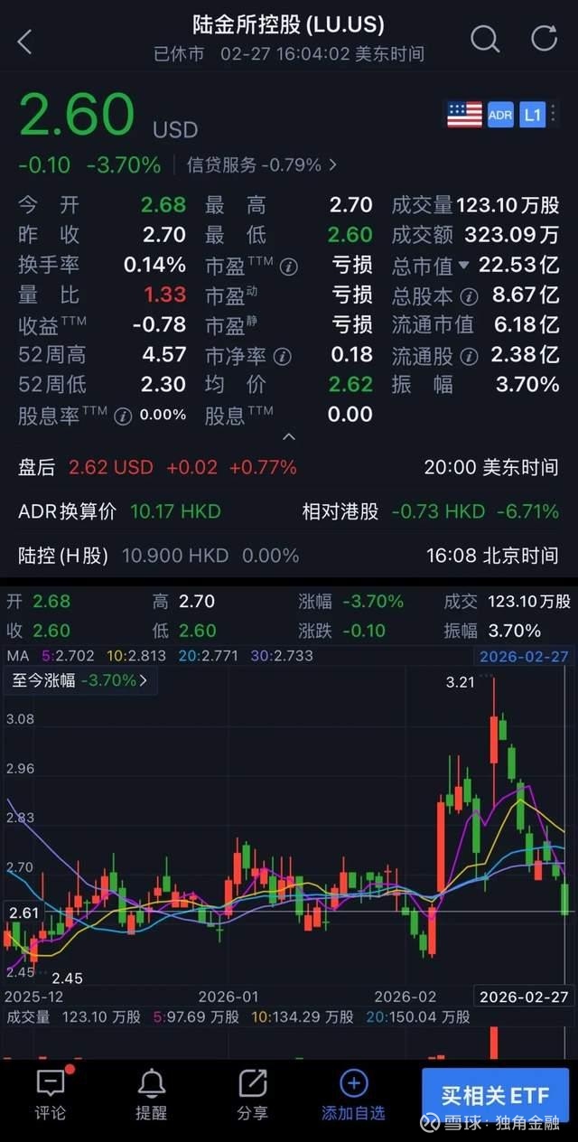 作为金融科技中概股巨头,陆金所于2020年赴美上市,市值一度高达480亿美元,但随着公司业绩承压,其股价也逐步下跌。2月27日收盘,公司股价为2.6美元/ADS,总市值为22.53亿美元。