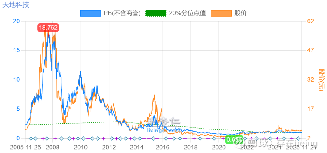 由于天地科技的利润因为已不具有参考性,我认为观察市净率相对更好的指标,从市净率角度来说,当前不是历史最低,但基本上属于低估区域,但股价似乎多年没有大的波动。只是平稳的上涨,在价值投资里面就是我们享受的分红和利润再投资的升值,所以在当前牛市的情况下,相对来说较为低估。