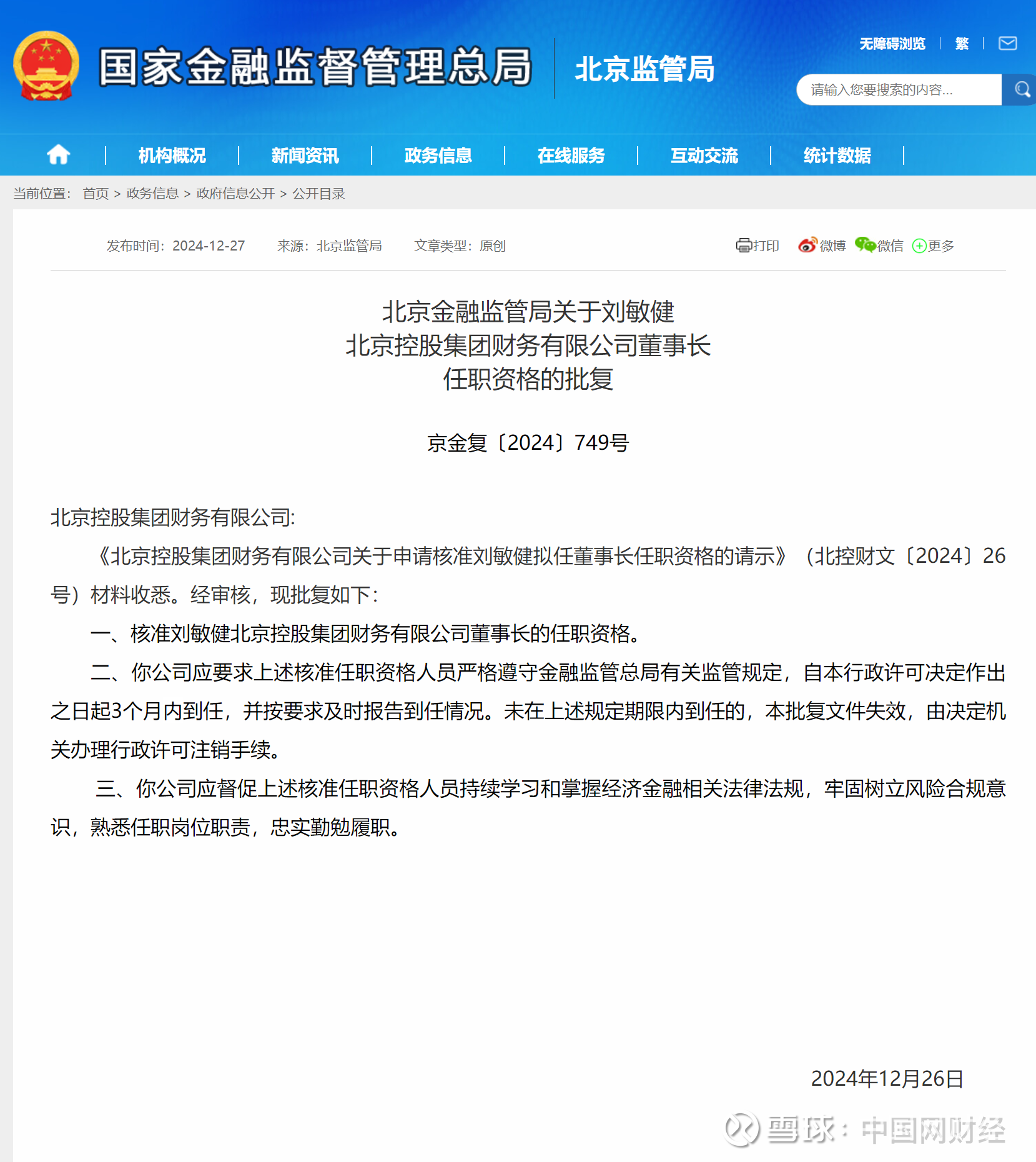 中国网财经12月30日讯 日前,北京金融监管局公布相关批复信息,核准刘敏健北京控股集团财务有限公司(简称:北控财务公司)董事长的任职资格。以下是相关批复正文: