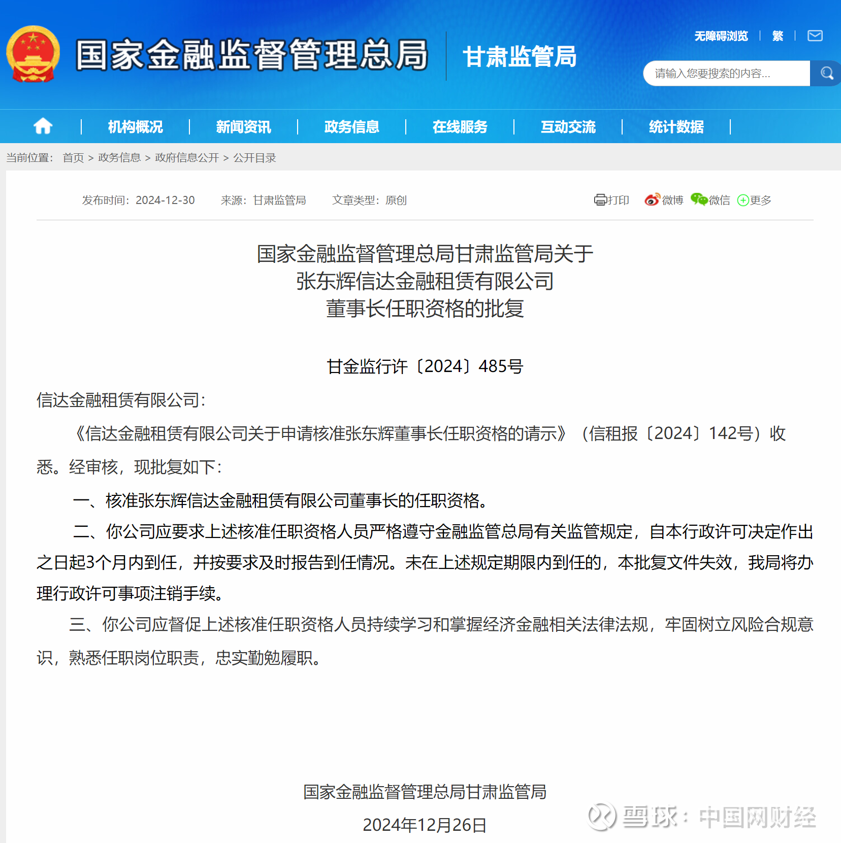 中国网财经12月31日讯 昨日,国家金融监督管理总局甘肃监管局(简称:甘肃监管局)公布相关批复,核准张东辉信达金融租赁有限公司(简称:信达金租)董事长的任职资格。以下是相关批复正文: