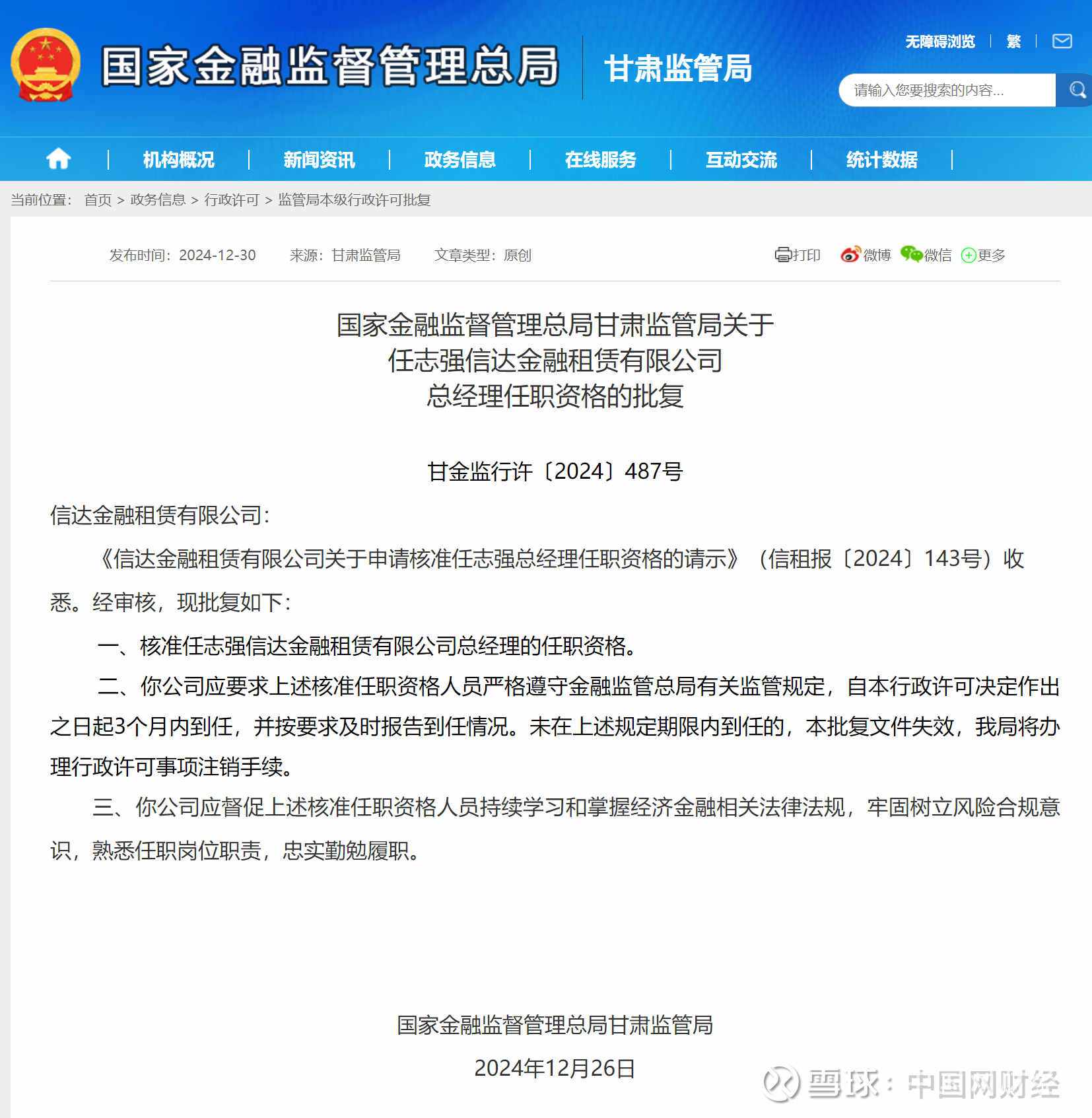 同时,甘肃监管局核准任志强信达金租总经理的任职资格。以下是相关批复正文: