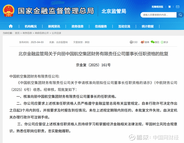 中国网财经4月7日讯 日前,北京金融监管局公布相关批复信息,核准向丽中国航空集团财务有限责任公司(简称“中国航空集团财务公司”)董事长的任职资格。以下是相关批复正文: