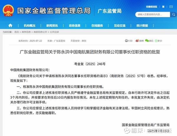 中国网财经7月22日讯 今日,广东金融监管局公布相关批复,核准陈永洪中国南航集团财务有限公司(简称“南航财务公司”)董事长的任职资格。以下是相关批复正文: