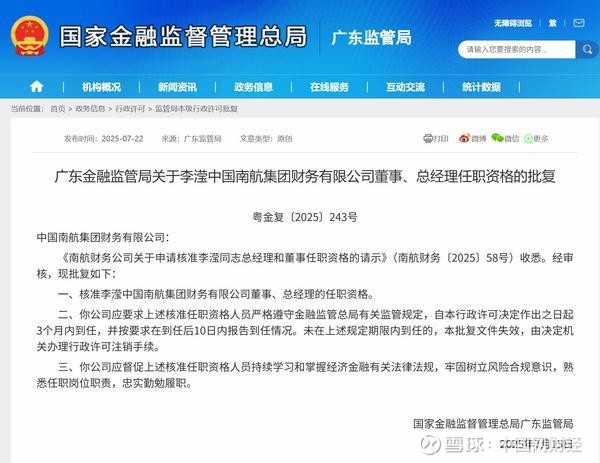 同时,广东金融监管局核准李滢南航财务公司董事、总经理的任职资格。以下是相关批复正文: