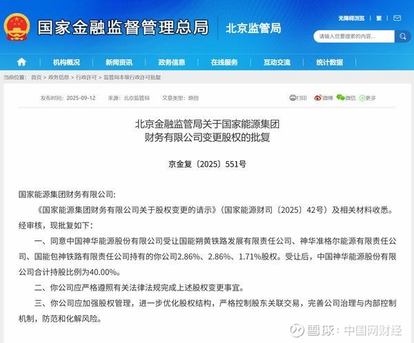 中国网财经9月15日讯 日前,北京金融监管局公布相关批复,同意中国神华能源股份有限公司(简称“中国神华”)受让国能朔黄铁路发展有限责任公司、神华准格尔能源有限责任公司、国能包神铁路有限责任公司持有的国家能源集团财务有限公司(简称“国家能源集团财务公司”)2.86%、2.86%、1.71%股权。受让后,中国神华合计持股比例为40.00%。