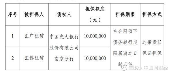 中国网财经10月9日讯 日前,江苏金租(证券代码:600901.SH)发布相关公告披露,近日,公司与中国光大银行股份有限公司南京分行(以下简称“光大银行”)签订《保证合同》,为汇广(天津)航运租赁有限公司(以下简称“汇广租赁”)、汇博(天津)航运租赁有限公司(以下简称“汇博租赁”)的有关贷款提供担保。汇广租赁、汇博租赁是江苏金租经原中国银保监会江苏监管局批准后,为开展跨境船舶租赁业务而在境内保税地区设立的全资项目公司。具体担保情况如下: