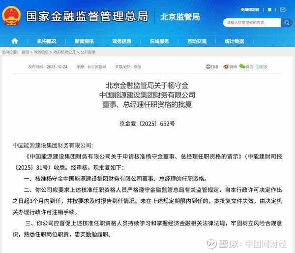 中国网财经10月27日讯 日前,北京金融监管局公布相关批复,核准杨守金中国能源建设集团财务有限公司(简称“中国能源建设集团财务公司”)董事、总经理的任职资格。以下是相关批复正文: