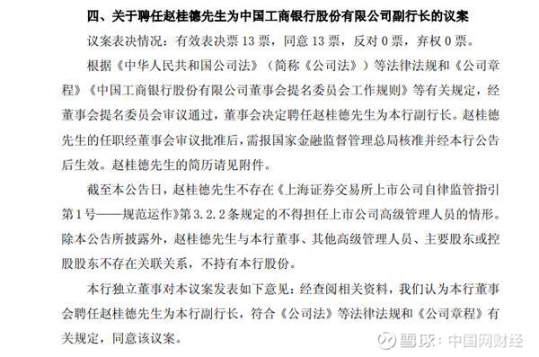 中国网财经10月31日讯 昨日,工商银行发布公告称,董事会于2025年10月30日召开会议,审议通过了《关于聘任赵桂德先生为中国工商银行股份有限公司副行长的议案》。经董事会提名委员会审议通过,该行董事会决定聘任赵桂德为副行长。赵桂德的任职经董事会审议批准后,需报国家金融监督管理总局核准并经该行公告后生效。