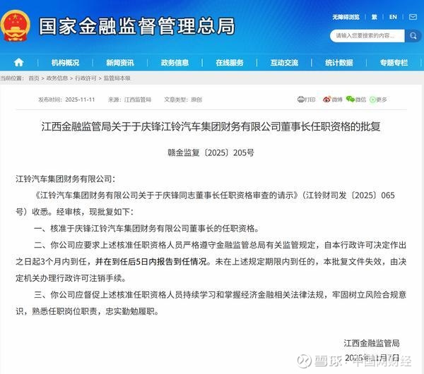 中国网财经11月12日讯 昨日,江西金融监管局公布相关批复,核准于庆锋江铃汽车集团财务有限公司(简称“江铃汽车财务公司”)董事长的任职资格。以下是相关批复正文: