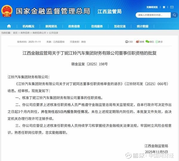 同时,江西金融监管局核准丁妮江铃汽车财务公司董事的任职资格。以下是相关批复正文: