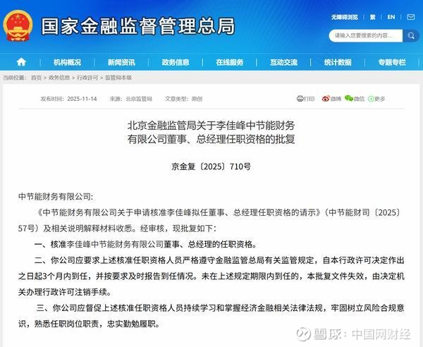 中国网财经11月17日讯 日前,北京金融监管局公布相关批复,核准李佳峰中节能财务有限公司(简称“中节能财务公司”)董事、总经理的任职资格。以下是相关批复正文: