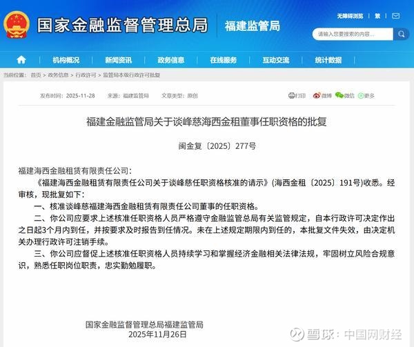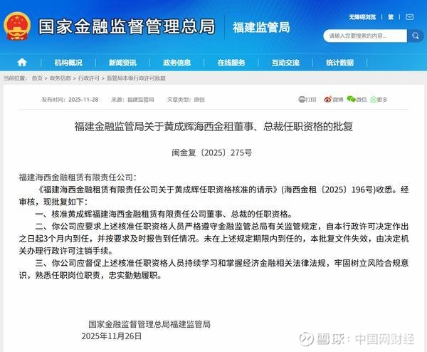 同时,福建金融监管局核准黄成辉海西金租董事、总裁的任职资格,核准谈峰慈海西金租董事的任职资格。以下是相关批复正文: