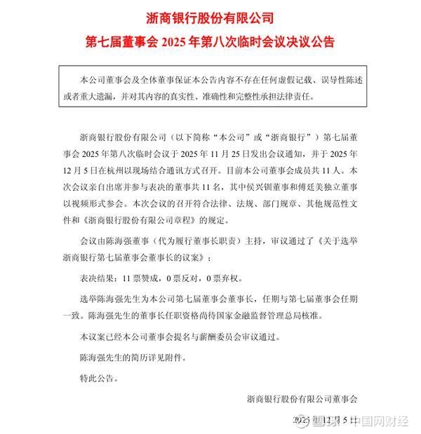 中国网财经12月8日讯 近日,浙商银行发布公告显示,该行第七届董事会2025年第八次临时会议审议通过了《关于选举浙商银行第七届董事会董事长的议案》,选举陈海强为浙商银行第七届董事会董事长,任期与第七届董事会任期一致。陈海强的董事长任职资格尚待国家金融监督管理总局核准。