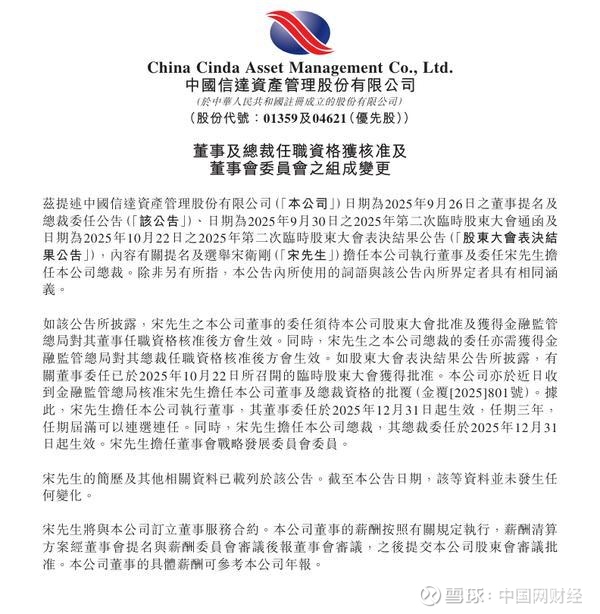 中国网财经1月6日讯 1月5日,中国信达资产管理股份有限公司发布公告显示,该公司于近日收到金融监管总局核准宋卫刚担任该公司董事及总裁资格的批复。据此,宋卫刚担任中国信达资产管理股份有限公司执行董事,其董事委任于2025年12月31日起生效,任期三年,任期届满可以连选连任。同时,宋卫刚担任中国信达资产管理股份有限公司总裁,其总裁委任于2025年12月31日起生效。此外,宋卫刚担任董事会战略发展委员会委员。