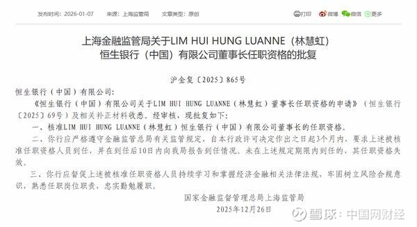 恒生银行(中国)董事长林慧虹任职资格获批