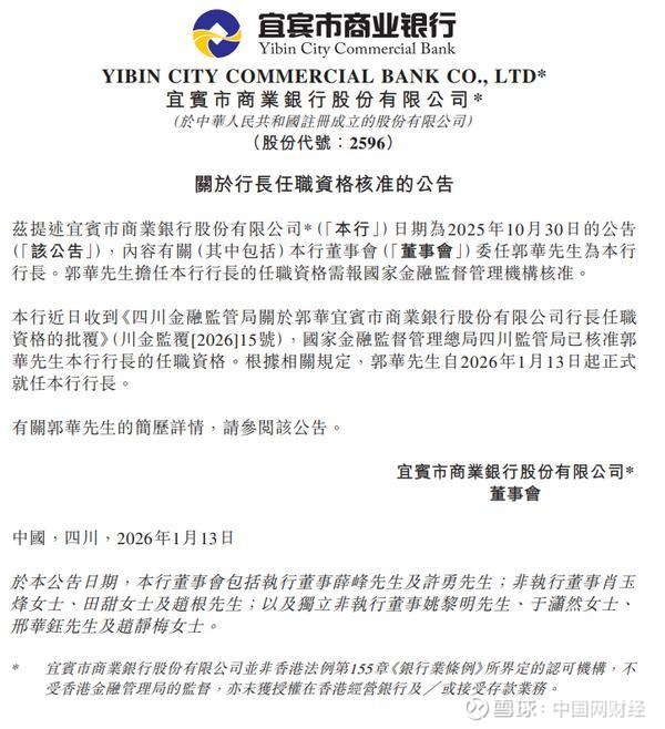 中国网财经1月14日讯 昨日,宜宾市商业银行发布公告,该行近日收到《四川金融监管局关于郭华宜宾市商业银行股份有限公司行长任职资格的批覆》(川金监覆[2026]15号),国家金融监督管理总局四川监管局已核准郭华该行行长的任职资格。根据相关规定,郭华自2026年1月13日起正式就任该行行长。