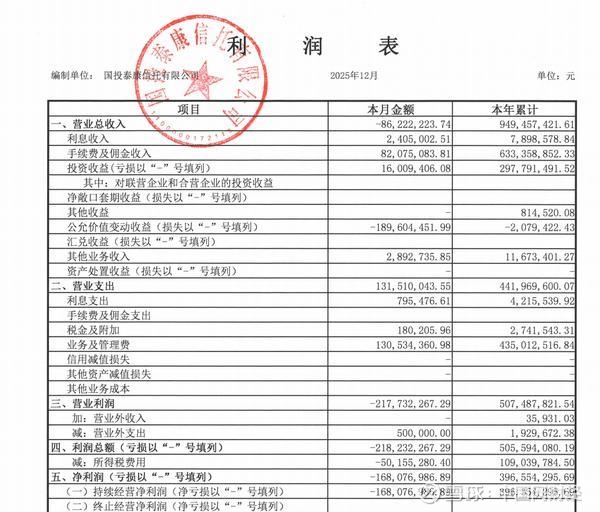 中国网财经1月15日讯 今日,国投资本(证券代码:600061.SH)发布相关公告披露,2025年国投泰康信托实现营业收入9.49亿元,同比下降35.25%。其中,利息收入789.86万元,同比下降约40%;手续费及佣金收入6.33亿元,同比下降超50%,投资收益2.98亿元,较2024年小幅上升。2025年国投泰康信托利润总额5.06亿元;净利润3.97亿元,同比下降44.27%。