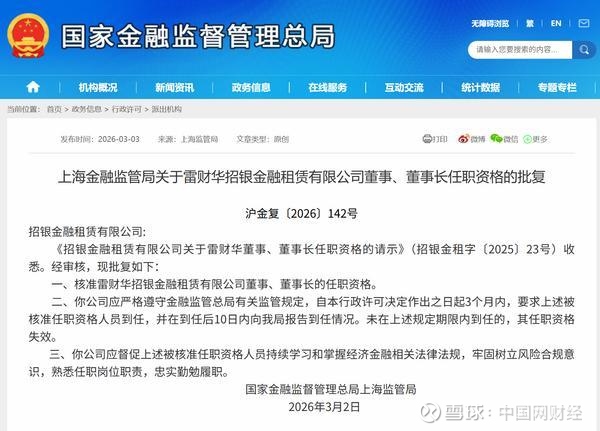 中国网财经3月13日讯 日前,上海金融监管局公布相关批复,核准雷财华招银金融租赁有限公司(简称“招银金租”)董事、董事长的任职资格。以下是相关批复正文: