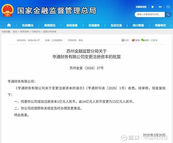 中国网财经3月27日讯 今日,苏州金融监管分局公布相关批复信息,同意亨通财务有限公司(简称“亨通财务公司”)增加注册资本1亿元人民币,由14亿元人民币变更为15亿元人民币。以下是相关批复正文: