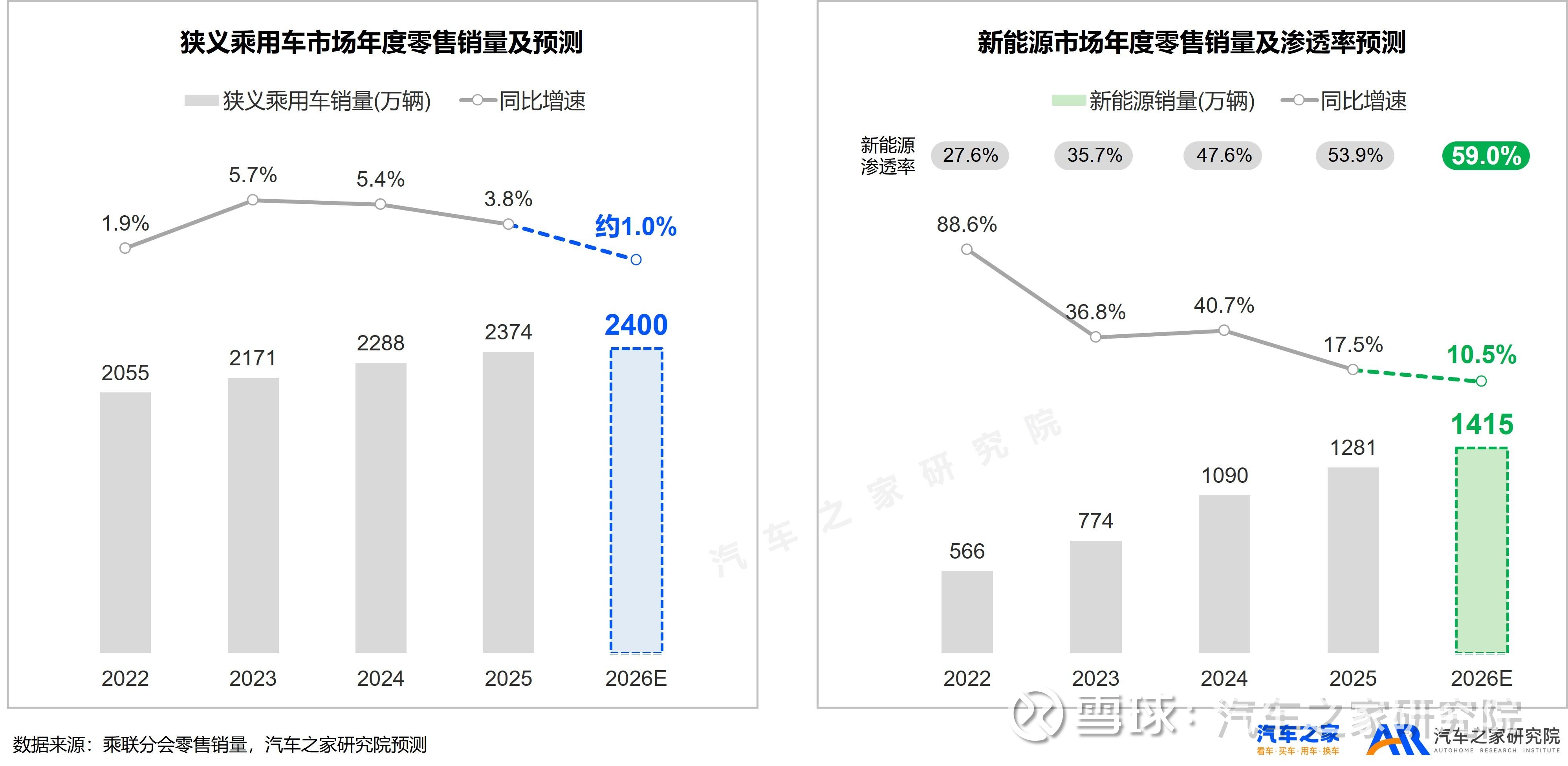 对于新能源市场的判断需考虑政策和市场两方面因素。从政策来看,新能源购置税调整为减半征收,最高减免额度下调至1.5 万元,价格竞争力下降,抑制需求增长;同时,购置税政策提高插混&增程车纯电里程门槛,低续航插混车型短期供给收缩。而从市场因素来看,插混&增程市场增长失速,对新能源市场推动力减弱。同时,汽车之家数据显示,偏好新能源的用户占比在增至60%后进入平台期,也预示着新能源市场发展放缓。汽车之家研究院判断,2026年新能源市场销量1415万,渗透率59%,同比增长10.5%,恐将迎来最后一年两位数增长。