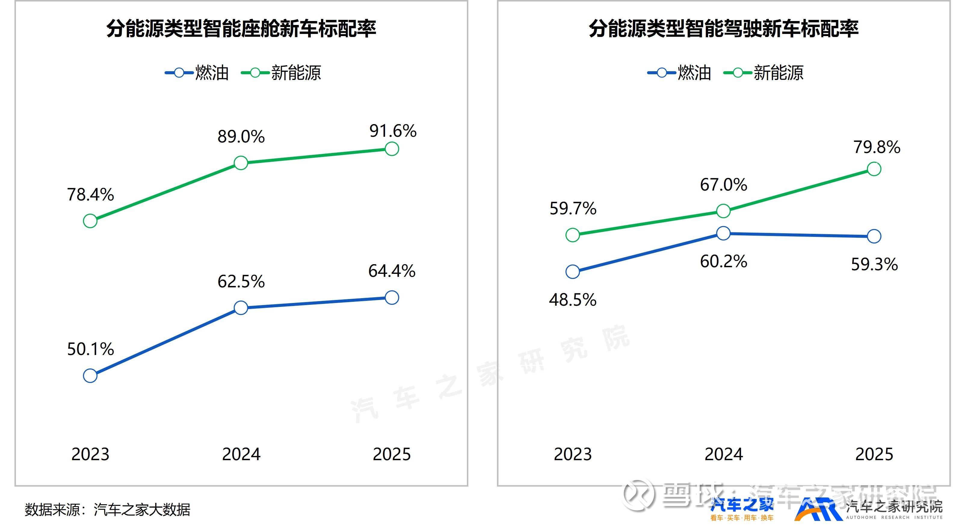 而在新能源智能化快速发展之时,燃油车是否跟上了智能化的步伐?从汽车之家数据来看,油电尚未“同智”。2025年燃油车在智能座舱和智能辅助驾驶的新车装配上并没有明显增长,尤其是智能辅助驾驶,增长陷入停滞。与新能源新车相比,燃油车在无论是在智能辅助驾驶还是在智能座舱方面都存在明显差距,目前仅处在新能源2023年前的水平。
