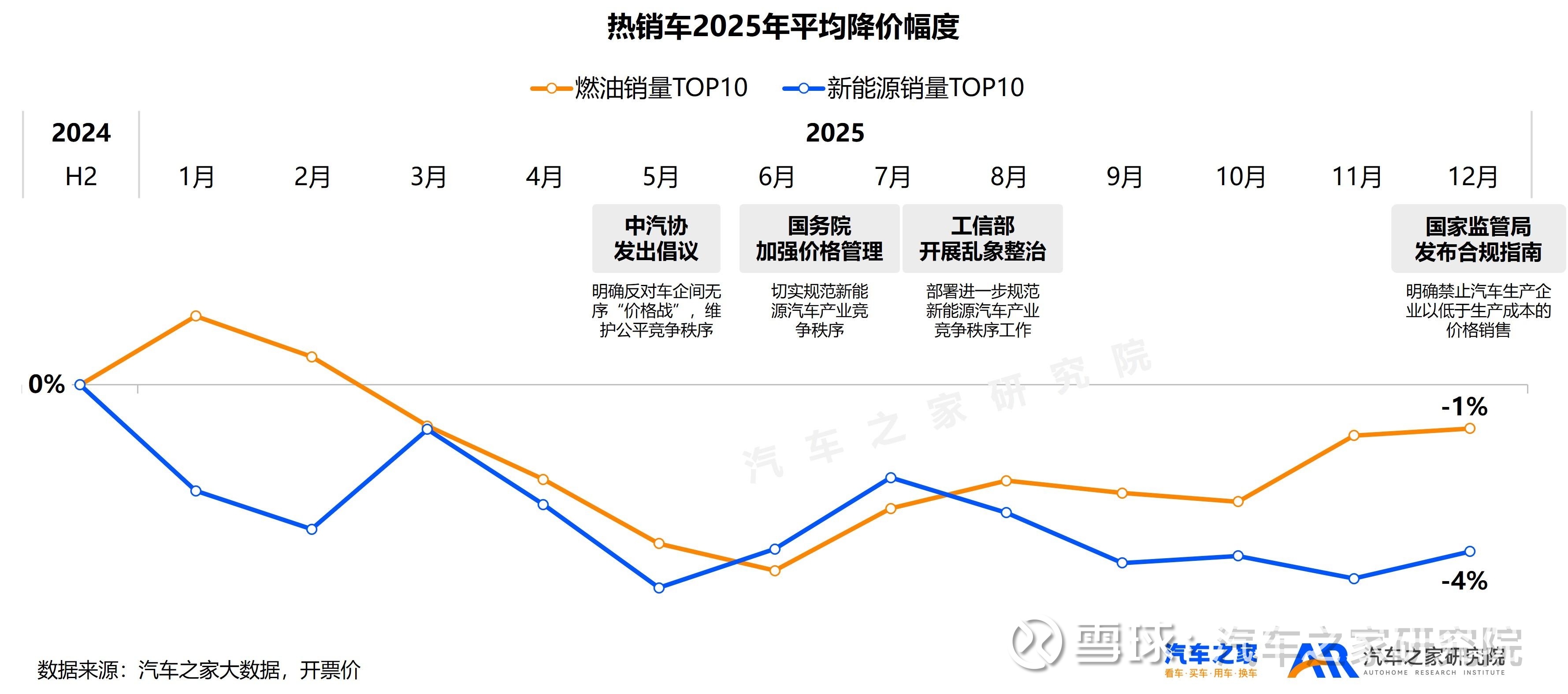 为了进一步验证这一情况,我们分别查看了燃油和新能源市场销量TOP10车型的平均降价幅度,我们发现燃油车下半年降价幅度收窄已现成效,而新能源市场激烈竞争之下,降价幅度短暂收窄后又持续扩大,降价情况未见明显改善。