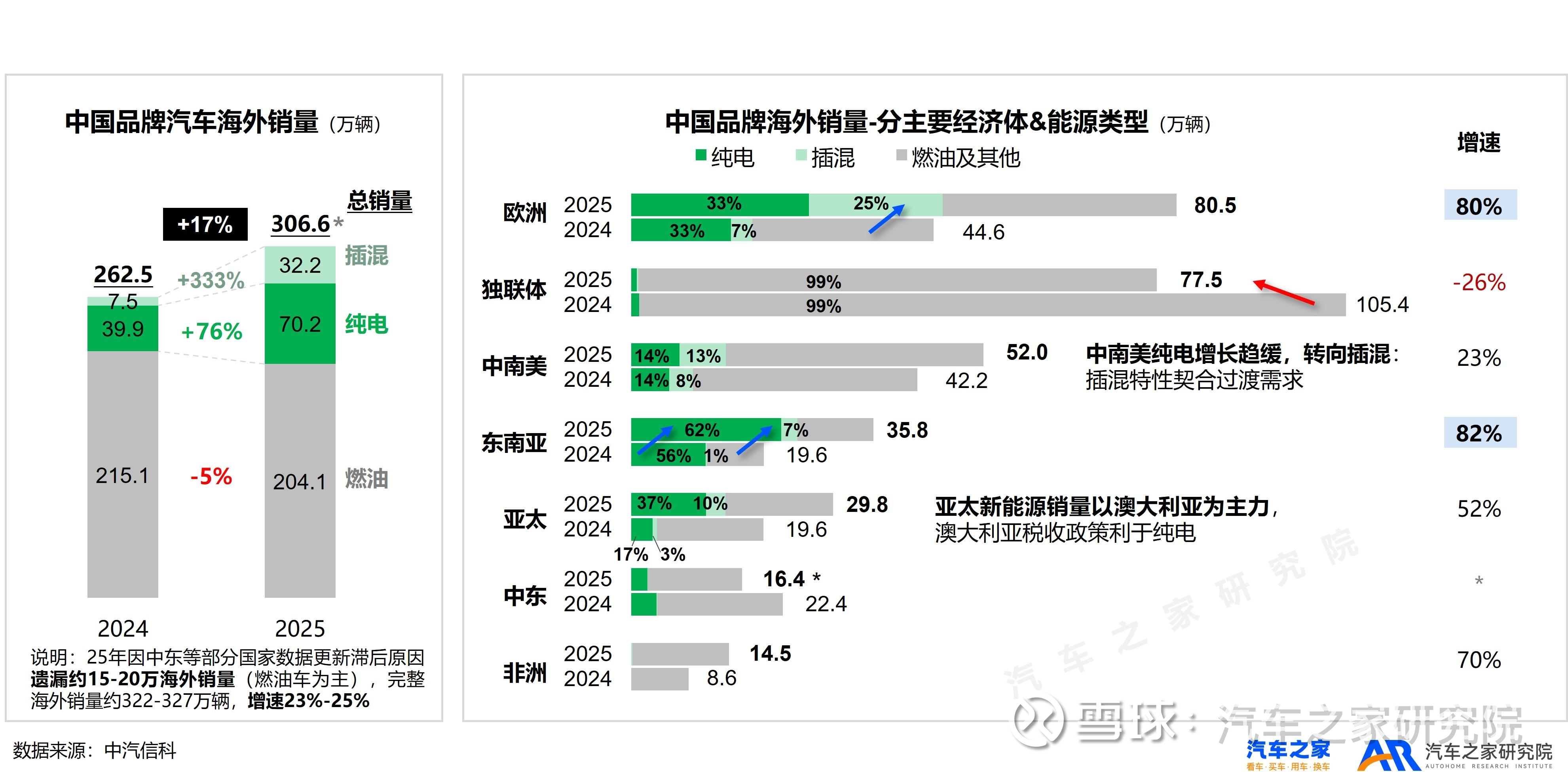 1) 新能源带动增长,呈现“插混爆发、纯电恢复”的显著特征。其中,插混“可油可电”的特性能有效缓解里程焦虑,契合充电基础设施薄弱地区(中南美、东南亚 )的过渡期需求,2年间持续高速增长。而纯电的恢复性增长主要得益于中国车企对东南亚、中南美、澳新等市场的开拓布局,抵消了欧盟、美加对华电动车加征关税的负面影响。