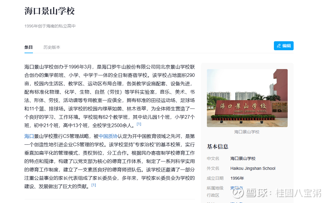 然后几个学校:海口市罗牛山学校显示该校占地100亩;海口景山学校占地约290亩。