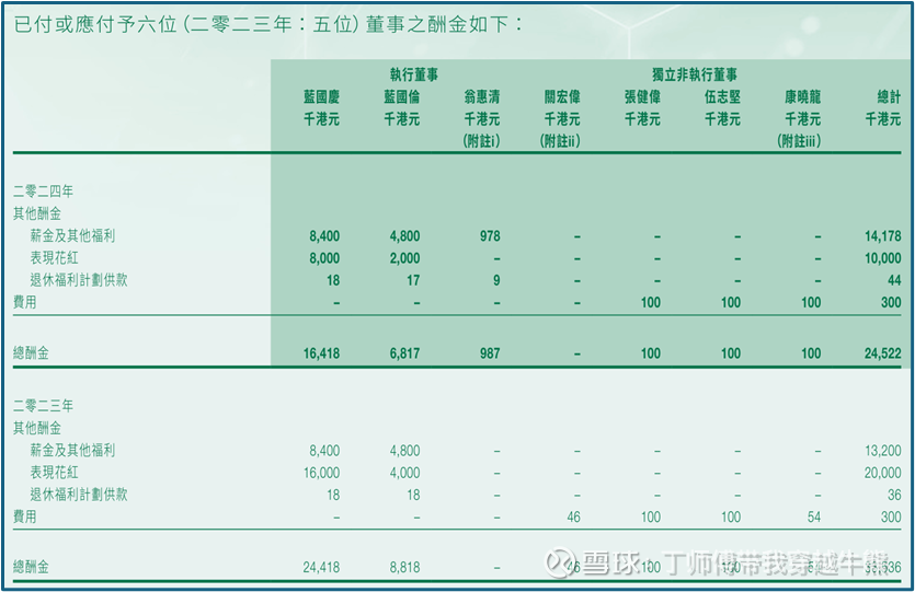 (2)同一时间,大股东蓝老板给自己开工资倒是一点不含糊,2023年度开了0.24亿港元的薪酬,2024年度开了0.16亿港元的薪酬,远大于公司的分红派息总额。当然,自家兄弟的薪酬也不低,2024年度有0.07亿港元的薪酬。