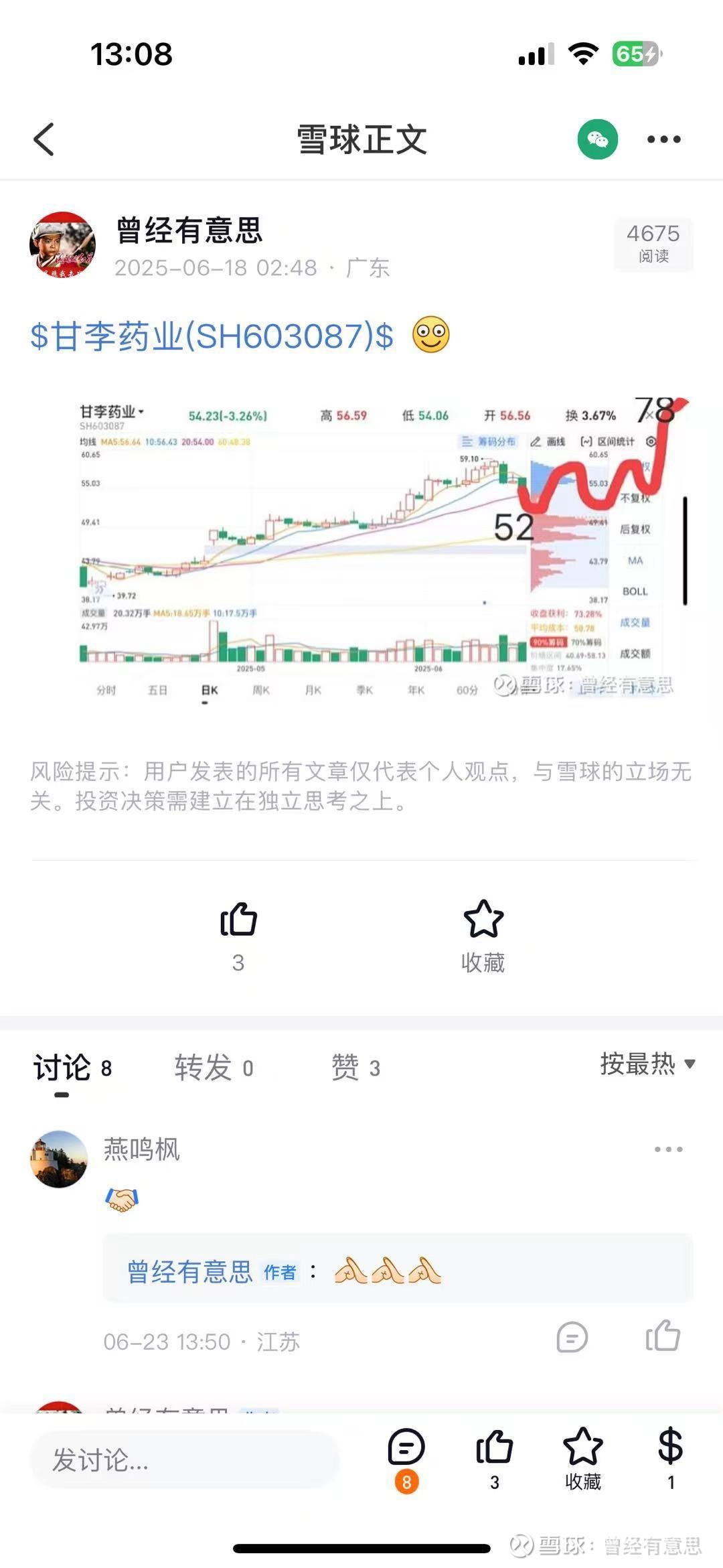 $甘李药业(SH603087)$ 【等玫瑰开花、等大树长成】六月初帮甘李画了个股价运行图猜想,目前看大差不差,现在我想说,80-100这段是筹码真空区域,如果主力资金想过去的话,压力不大的,到100以上就是上市前一年的密集成交区了,那里会有压力,所以这波主升到100再做平台是可以的,至于到不到我也不知道,都是猜。【别瞅傻子,瞅地】,甘李这块地目前还是相当的便宜,股价怎么走不是我们可以胡乱猜测的,知道它便宜,知道这个甘李这个科研房不错那就足够了,其他【做时间的朋友】吧![]()