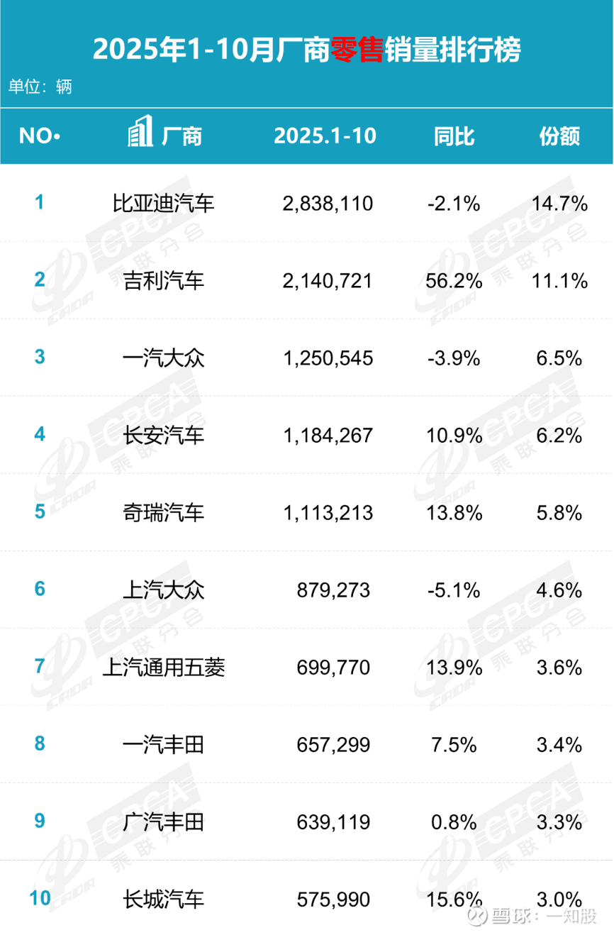 把时间拉长到前十个月,对比更刺眼。乘联分会统计,2025年1-10月,国内狭义乘用车市场零售1925万辆,同比增长8%,其中新能源增速21.9%,燃油车继续下滑。同期吉利零售214万辆,增速高达56.2%,足足比大盘快了近五十个百分点,是TOP10车企里增速最高的一家。