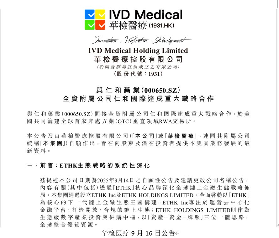 9月16日,华检医疗(01931.HK)发布公告宣布,与仁和药业(000650.SZ)间接全资附属公司仁和国际达成战略合作,共同于美国筹建全球首家专注于非处方药(OTC)领域的垂直RWA交易所。
