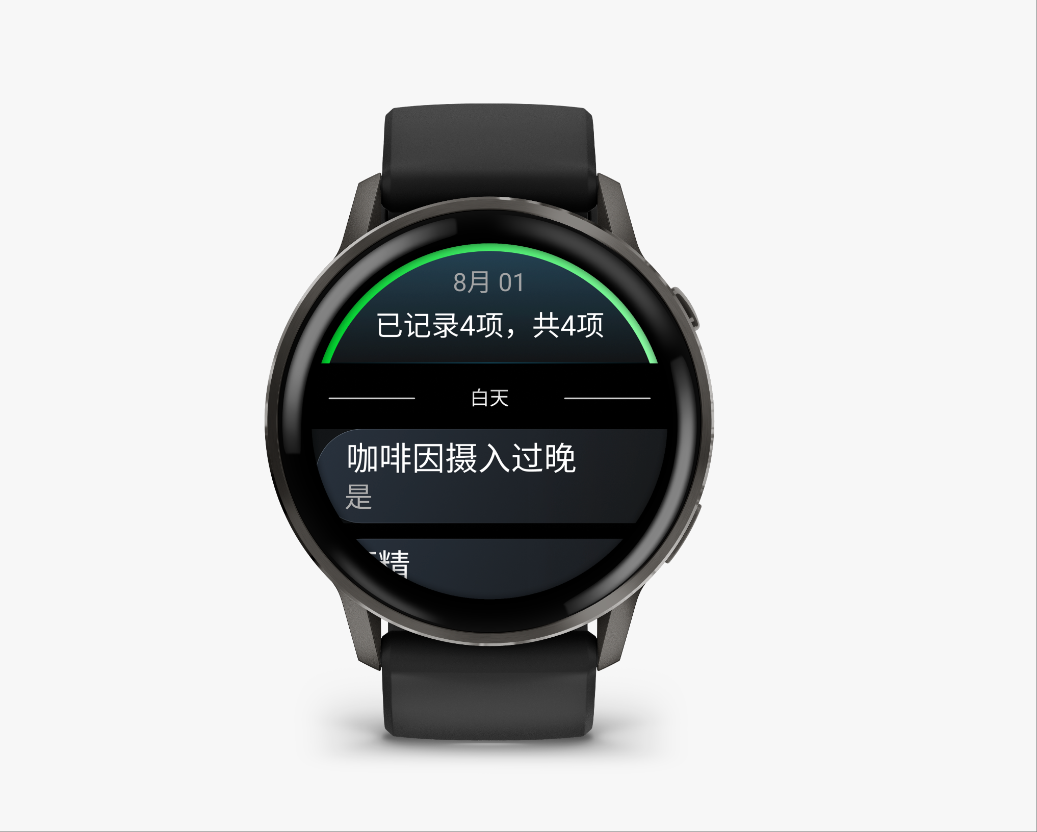 习惯记录与健康报告:Venu 4可自动关联并分析用户健康数据与用户记录的咖啡因、酒精摄入等生活习惯之间的关系,从而方便用户洞察生活习惯对睡眠、压力和HRV的具体影响。