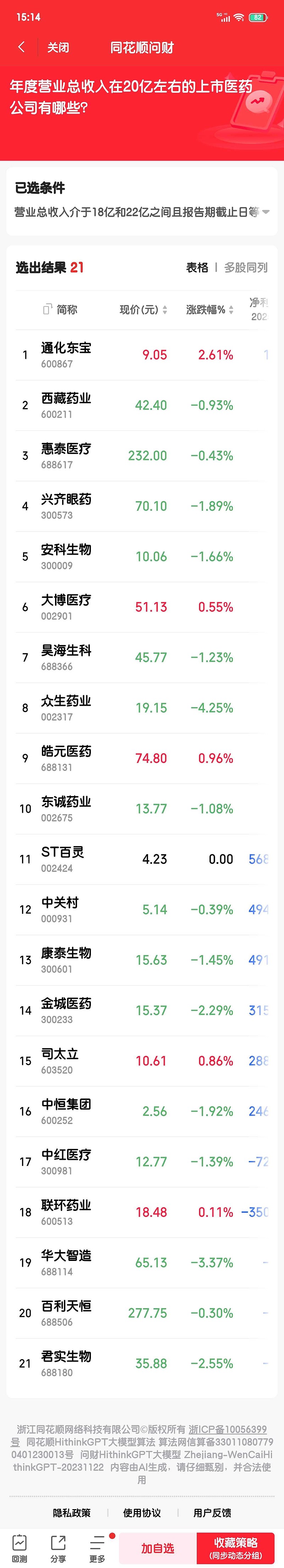 $联环药业(SH600513)$ 今天咱们来反向推导一下,联环的1801彻底失败,那么完全作为仿制药的联环药业今时今日市值应该是多少?翻了翻前几年的业绩,连环基本每年的营业总收入为20亿左右,对比了一下已经上市的每年营业收入20亿的医药公司如下表,你会发现联环在这里面已经是倒数了。就是说现在这个大盘点位,这个市值已经基本匹配作为仿制药上市公司的市值了。就算是彻底失败,最多一个跌停吧!那些说跌回8块9块的,尼不看看它8,9块时大盘3000点,现在大盘4200点了啊!