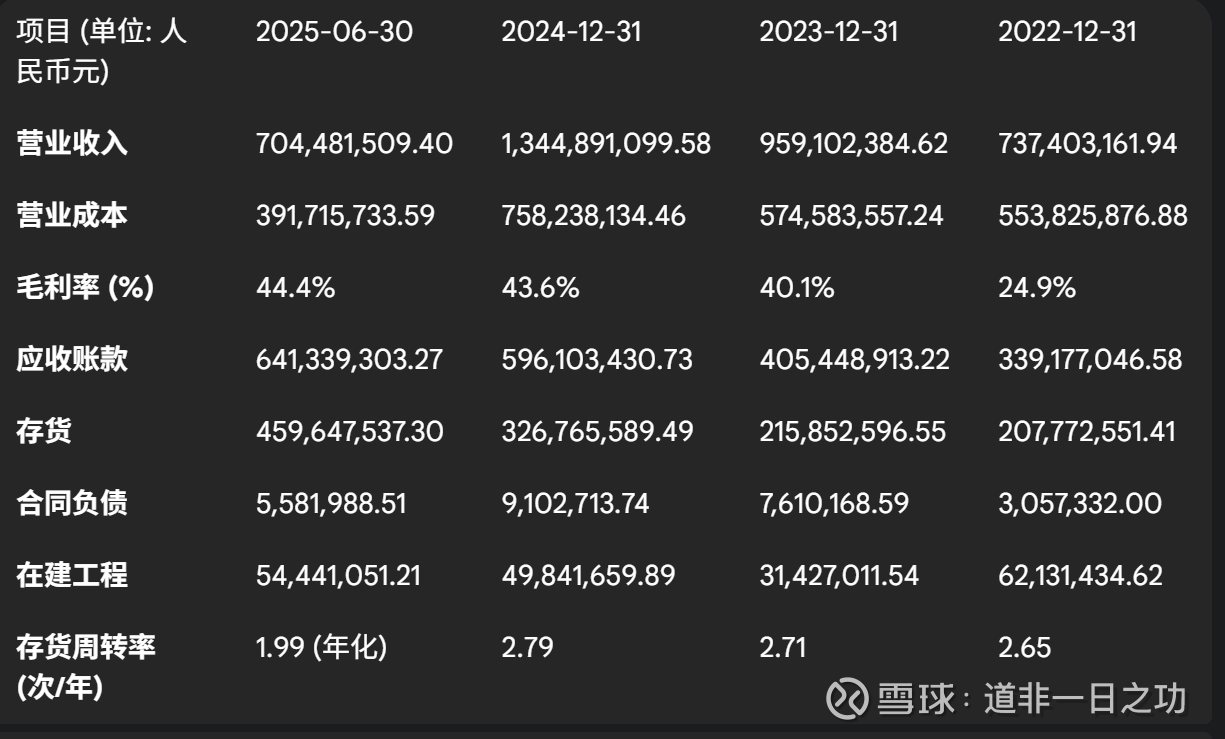 存货与周转率分析: 公司的存货规模从2022年末的2.08亿元激增至2025年6月末的4.60亿元,增速远超同期收入增速 1。与此同时,存货周转率呈现放缓趋势。表面上看,这似乎是运营效率下降的迹象。然而,公司在2025年半年报中明确指出,经营活动现金流净额大幅下降的主要原因之一是“公司增加原材料战略库存的支付” 1。这一解释与公司订单激增的背景高度吻合。面对创纪录的在手订单,提前锁定关键原材料,既能保障生产计划的顺利执行,又能对冲上游价格波动的风险,是一种理性的战略选择。因此,当前的存货积压和现金流出,应被视为支撑未来收入增长和锁定利润空间的必要投资,而非运营失控。