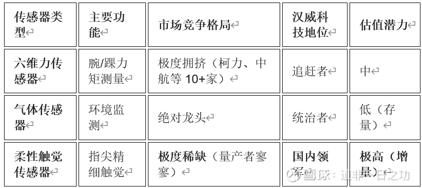 多模态融合:汉威通过投资并购,构建了“气体+触觉+惯性(IMU)”的全感知矩阵 4。在人形机器人场景中,单一传感器无法满足需求,汉威能够提供集成了触觉(能斯达)、力觉(投资企业)、嗅觉(本部)和姿态(投资无锡北微)的综合解决方案。这种平台化能力是单一零部件厂商无法比拟的。